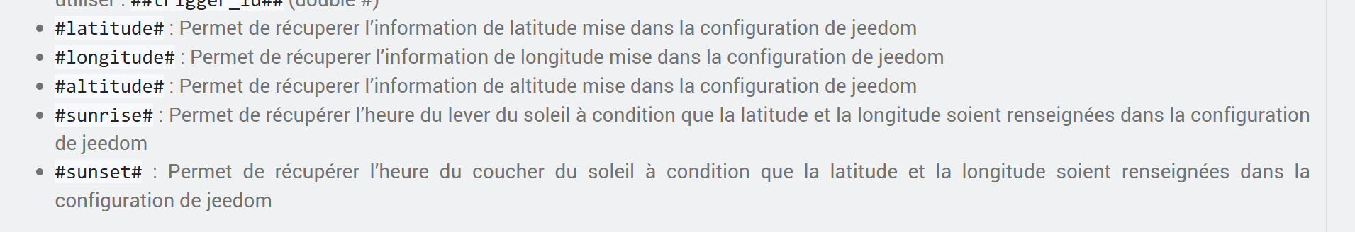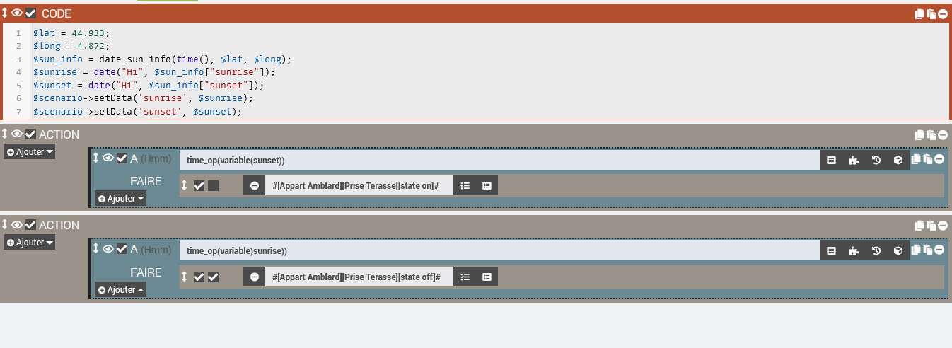 Je n’arrive pas à faire calculer l’heure de lever de soleil au sein du même scénario. J’ai essayé un sleep de 2 secondes entre les deux actions, idem (visible sur les logs au dessus) J’ai tenté de créer un second scenario rien que pour le lever du soleil, avec exactement la même syntaxe et là ça fonctionne.