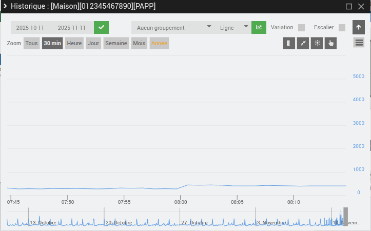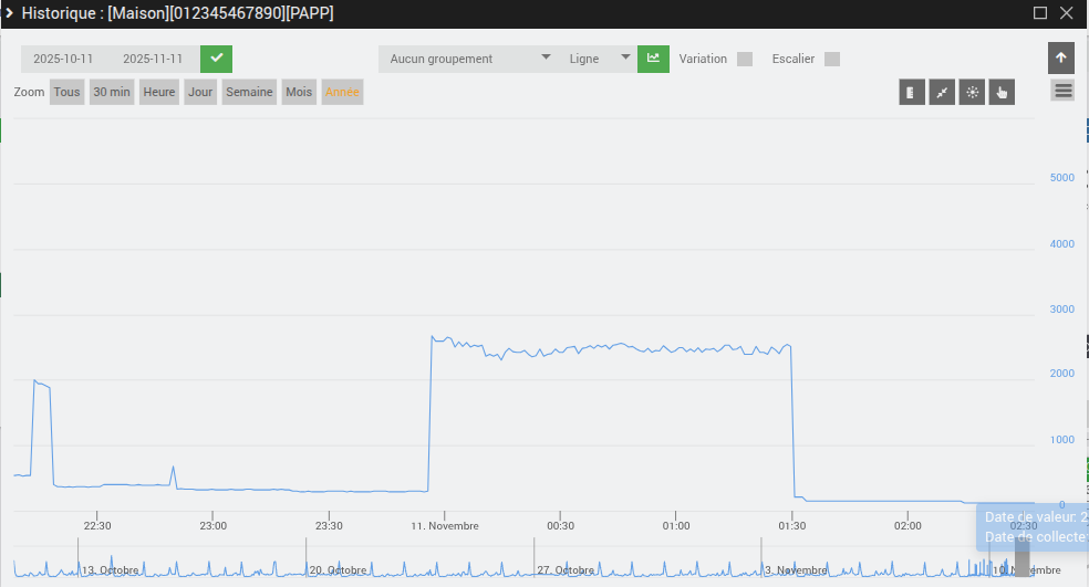 Et le ballon d’eau chaude se déclenche bien juste avant minuit (historique puissance apparente) environ 2500W