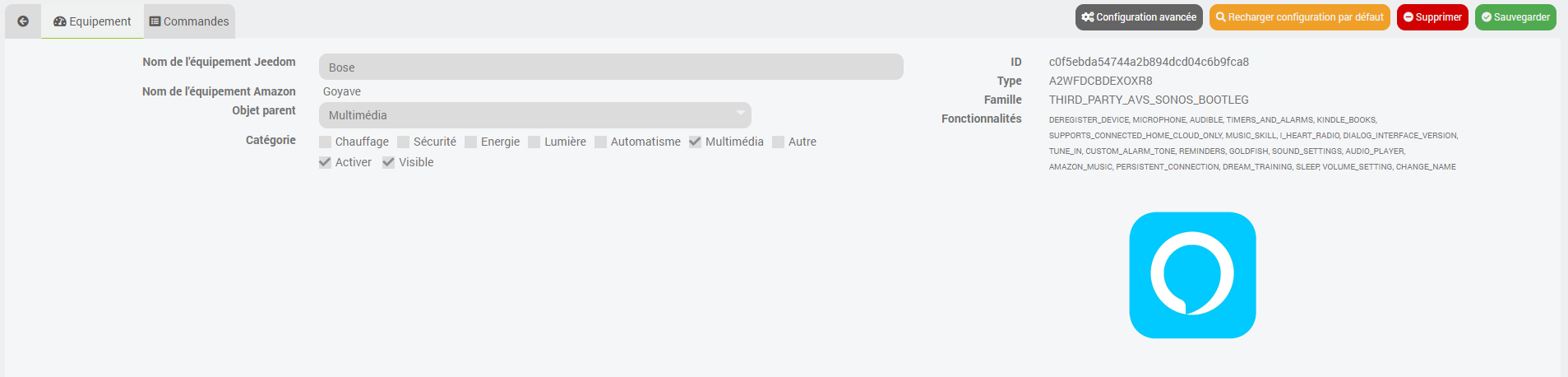 La barre est détectée par le plugin Alexa-API. C’est une barre bose qui peut être connecté via Alexa nativement (ou bien GA mais je ne l’utilise pas).