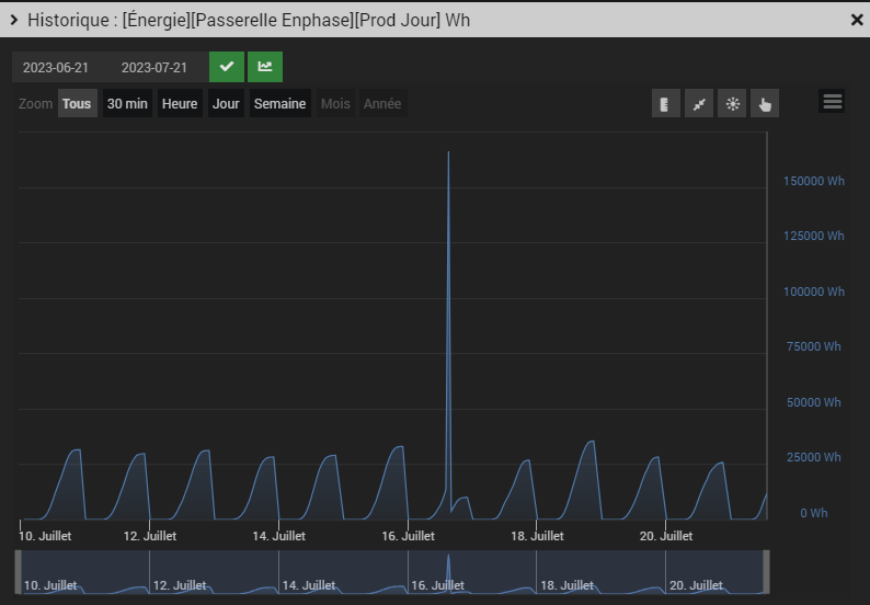 Lorsque j’ai mis ma production depuis la MES, la courbe de prod s’alimentait avec la valeur mais sans faire de delta durant la journée. Le référentiel calculé pour le début de journée n’était pas 0 mais la valeur de prod MES.