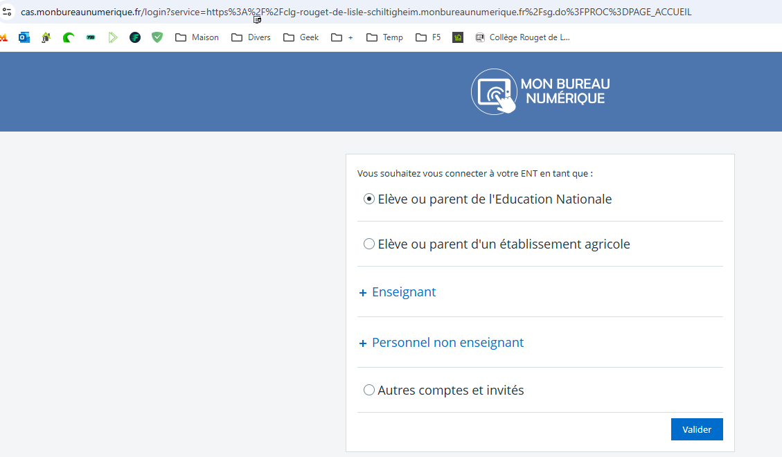J’ai essayé avec l’adresse mon bureau numerique, l’adresse pronote du college (apparement )
