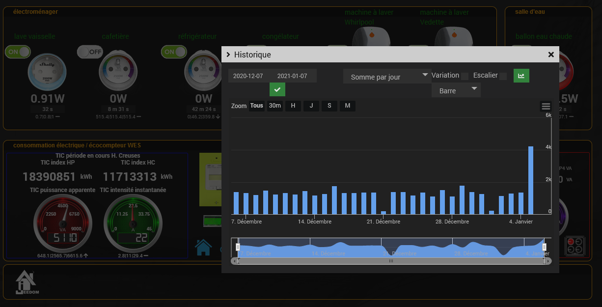 Je n’avais pas trop fait attention jusque la et en voulant il y a quelques jours accéder à l’historique de consommation de mon lave vaisselle qui donnait des signes de faiblesse, j’ai vu que dans mon design avec une photo de la cuisine et un widget de la prise pilotée au survol, le clic sur la commande ne lance pas l’historique (de mémoire en v3 ca fonctionnait, je dis bien de mémoire et ca date de mes débuts en v3, donc pas des dernières releases v3 avant mon passage en v4 d’avril 2020)