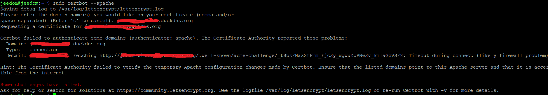 Bonjour, Après avoir testé tous les tutos possibles et suivi de nombreuses discussions, je n’arrive pas à obtenir un certificat avec certbot (j’ai suivi les instructions du site) ça bloque :