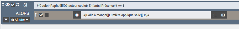 J’utilise un scenario pour la temporisation, après x minutes, si le détecteur n’a pas détecté de mouvement, la lampe s’éteint, sinon elle reste allumée x minutes de plus. Ce scenario éteint également automatiquement la lumière en cas d’activation manuelle de l’interrupteur. Curieusement, mes gosses trouvent l’interrupteur lorsqu’il fait sombre pour allumer, mais ils semblent avoir du mal à les trouver pour éteindre…