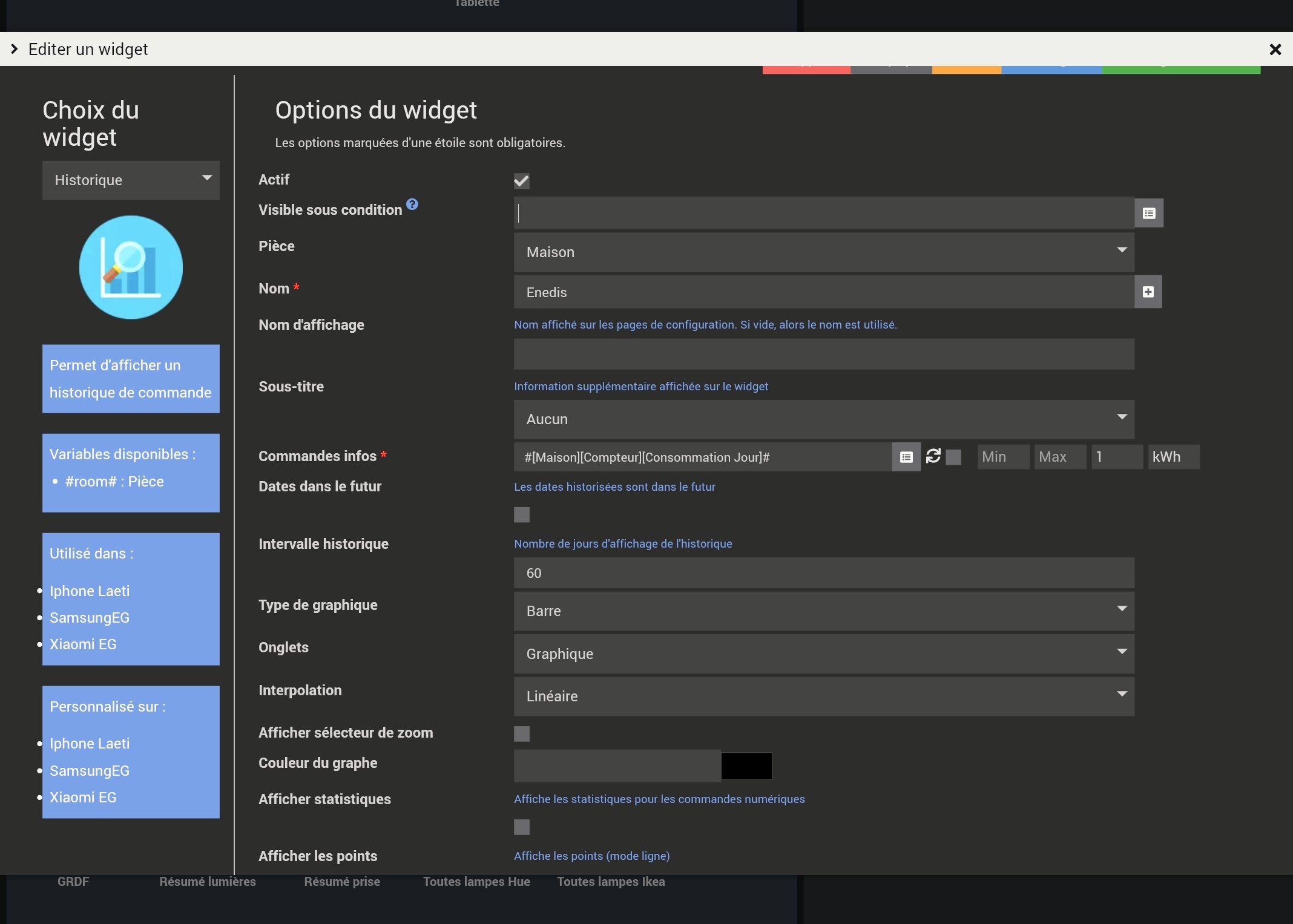 J’utilise plusieurs plugins de ce type pour suivre mes consos énergétiques. J’ai remarqué que leur affichage (sous forme de graphique barres, avec 2 mois d’historique) semble être dépendant de la puissance de la tablette ou telephone utilisée. En particulier, sur une Samsung A11+ ça rame dur (en gros je ne vois jamais le graphe). Est ce que la partie nécessitant un peu de ressource est faite au niveau de ma box jeedom (Luna) ou du périphérique l’affichant?