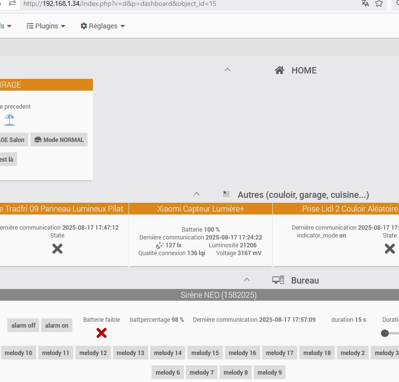 Avant d’avoir fait un « ménage » dans l’arborescence de mes objets, l’appui de l’icône Jeedom (en haut et à gauche) me permettait de revenir à l’affichage du dashboard en mode Résumé Global « simple » (tuiles des différents objets enfants). Cf. vue partielle ci-dessous :