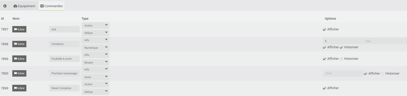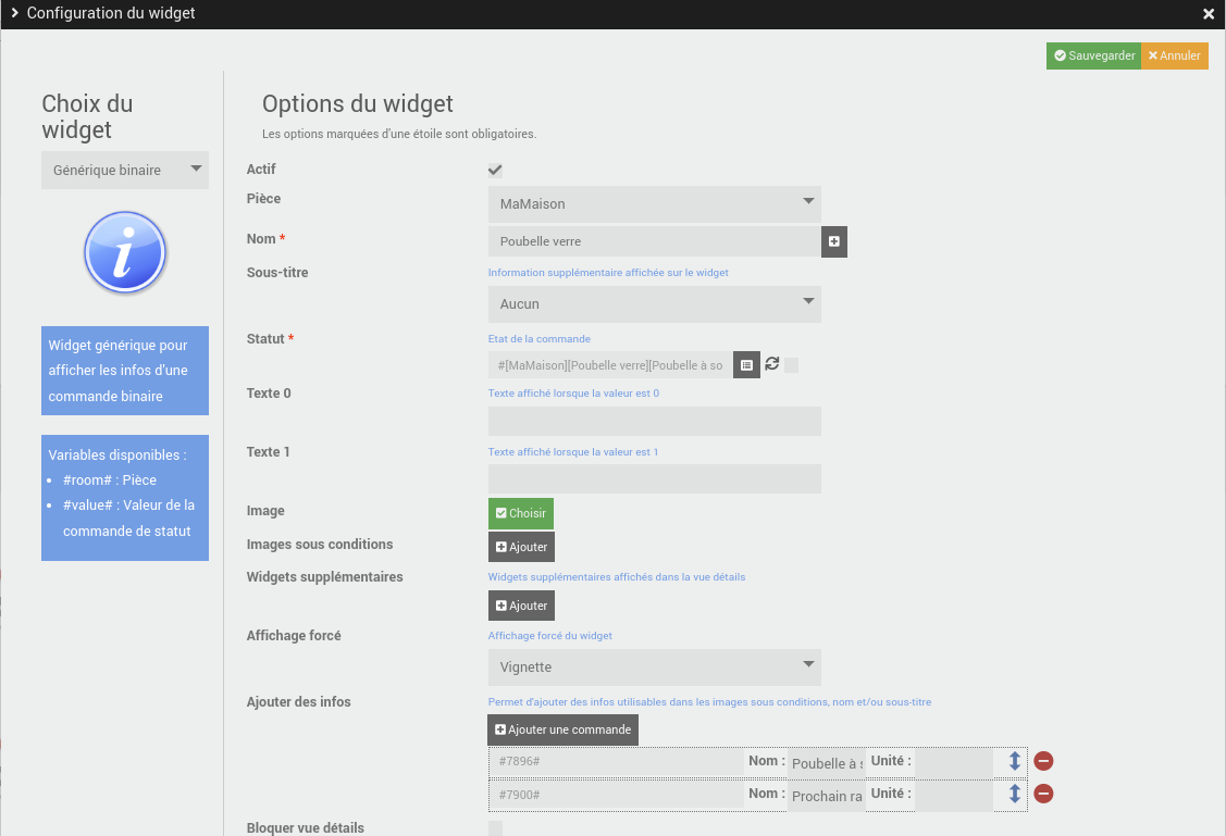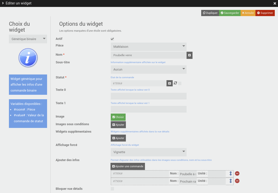 J’ai créé un widget de type « générique action » pour être prévenu lorsque je dois sortir ma poubelle pour le verre. Cela se base sur le plugin « My Bin ». Dans le widget « générique action », je constate que lorsque j’ajoute une commande dans « Ajouter des infos », c’est le numéro de la commande qui est affiché et pas son nom. Par contre, pour le « Statut », le nom s’affiche bien mais lorsque je sauvegarde le widget et que je le réouvre, c’est le numéro qui est affiché … A noter que pour les autres types de poubelles je n’ai pas eu ce souci : du coup je ne comprends pas d’où le problème peut venir (j’ai essayé de supprimer le widget et de le recréer mais cela ne change rien) …