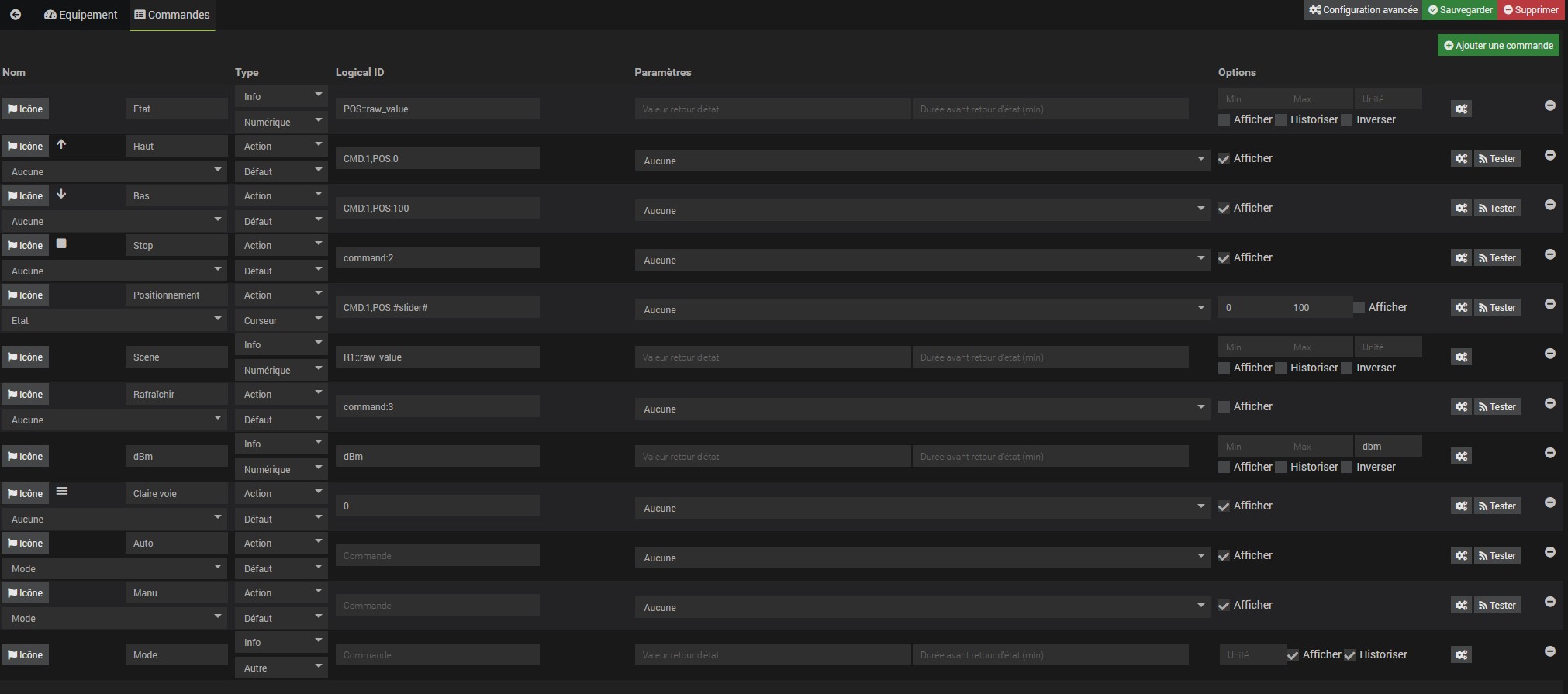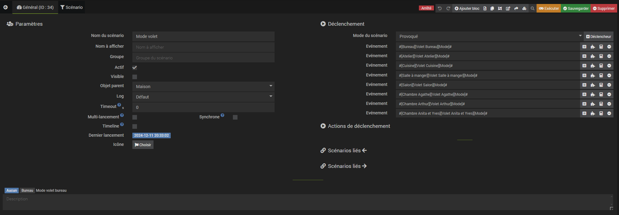 Pour éviter la multiplication des tuiles, j’ai rajouté dans la configuration du module deux boutons « action » (« auto » et « manu ») pour choisir le mode de chaque volet. Le bouton Auto entraine le mode auto et donc le volet est géré par le scénario et le bouton Manu entraine le mode manu et le volet est indépendant du scénario, mais les autres volets de la maison restent gérés par le scénario…