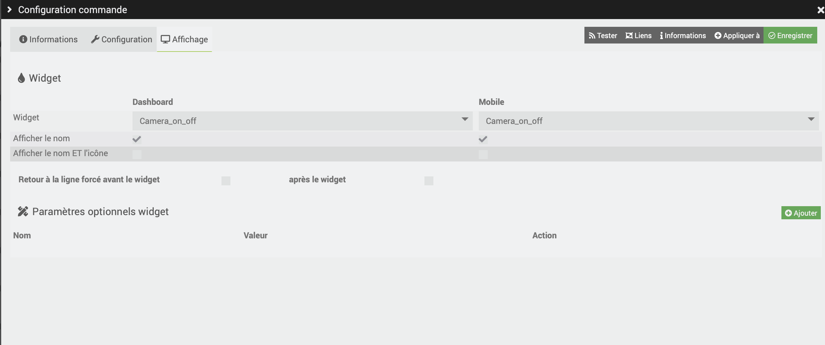 J’ai créer mon widget dans Outils (widget action) mais rien ne se passe je vois seulement le nom de la commande