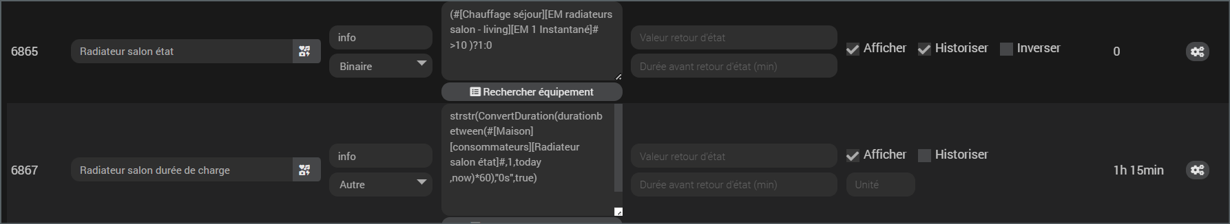strstr(ConvertDuration(durationbetween(#[Maison][consommateurs][Radiateur salon état]#,1,today ,now)*60),"0s",true)