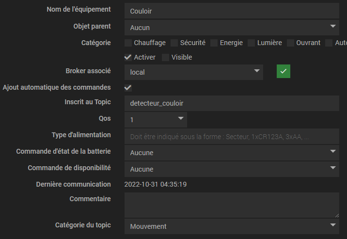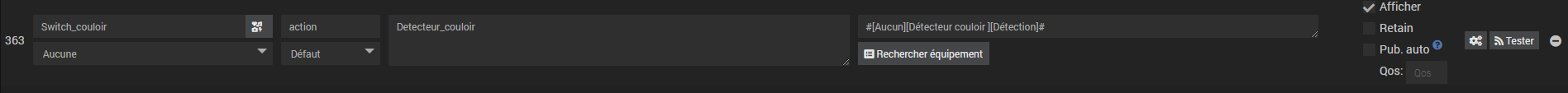 Est-ce que ma configuration est bonne, est-ce que lors d’un changement d’état du détecteur, l’information est bien envoyé sur le broker local et l’information stockée dans le topic: detecteur_couloir.