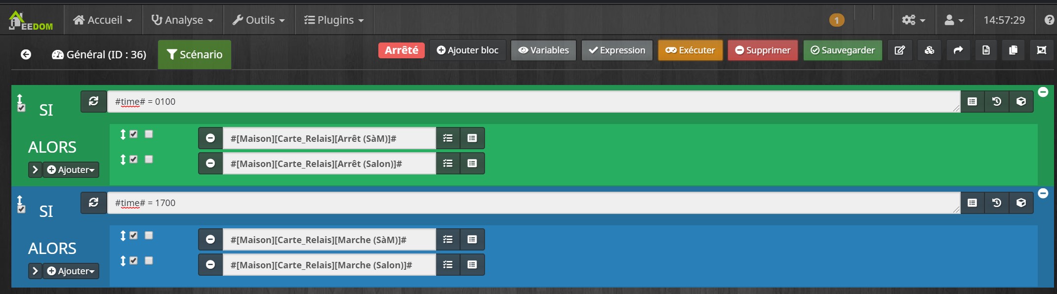 Je voudrais activer ou non des relais pilotés par une carte relais elle-même commandée par les ports GPIO du Raspberry (via le plugin Jeedouino). Pour faire simple, je souhaite ouvrir 2 relais entre 1h00 et 17h00