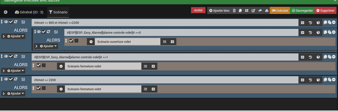 et oui , donc dans le scenario il faut reprendre ce bouton virtuelle « ouverture/fermeture » avec l’etat de l’alarme et les horaire et la condition de ne pas ouvrir automatiquement les volets si etat alarme « 1 » … je dis 1 mais j’entends alarme active.