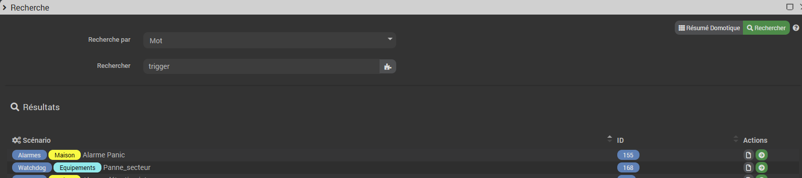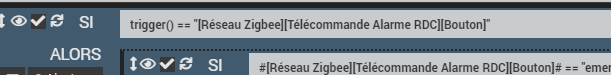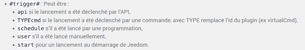 trigger(commande) : Permet de connaître le déclencheur du scénario ou de savoir si c’est bien la commande passée en paramètre qui a déclenché le scénario. => Deprecated il vaut mieux utiliser le tag #trigger#