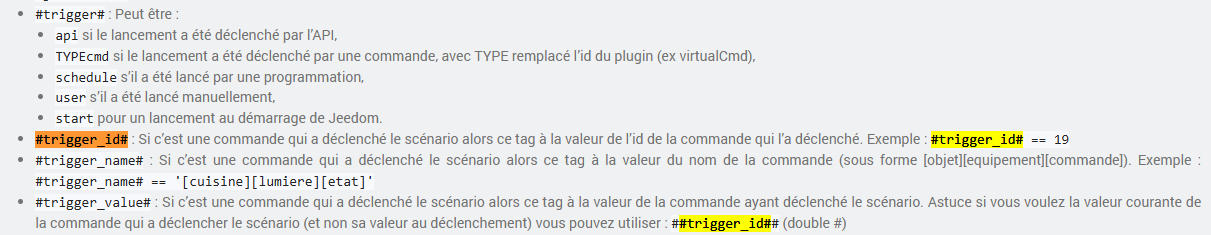 #trigger_id#: Si c’est une commande qui a déclenché le scénario alors ce tag à la valeur de l’id de la commande qui l’a déclenché. Exemple :#trigger_id# == 19