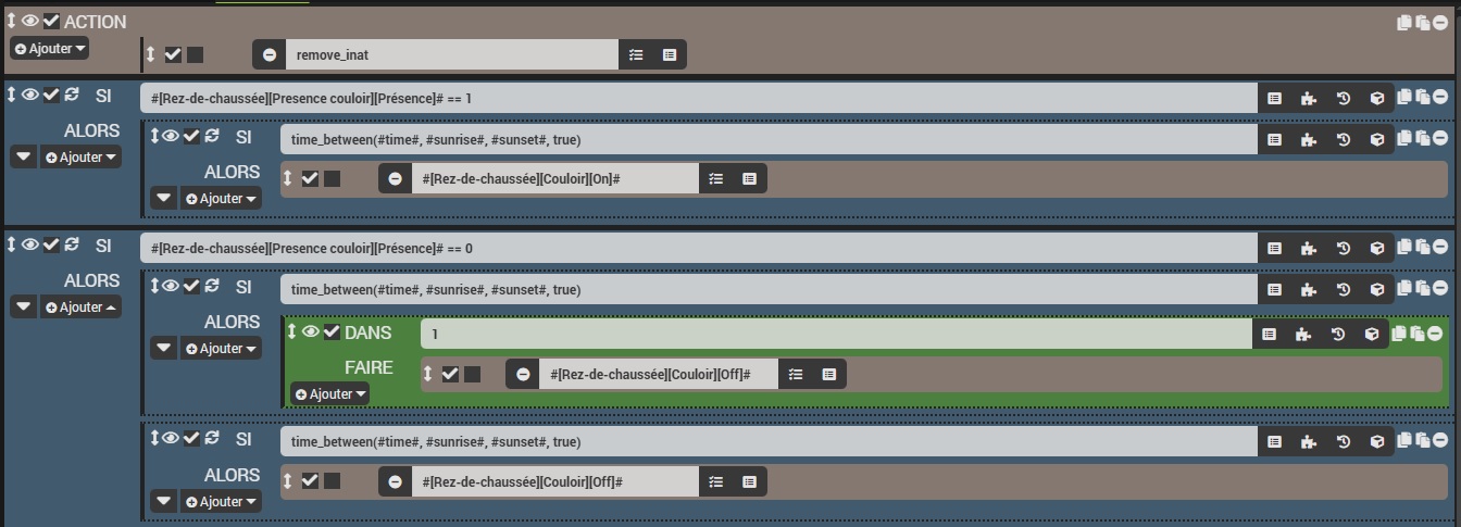 ALORS SI Variable LumiereAllumée = 1 (Variable permet de ne pas eteindre la lumière si quelqu'un repasse dans le couloir pendant la minute allumé)