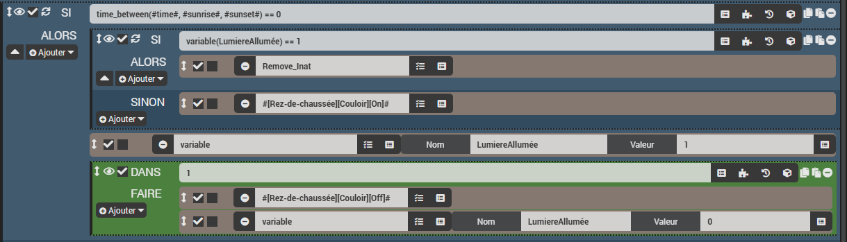 Si le déroulé du scénario est correct et que tout est OK, il suffira de remettre == 0 dans le scénario pour que cela ne fonctionne que la nuit ![]()