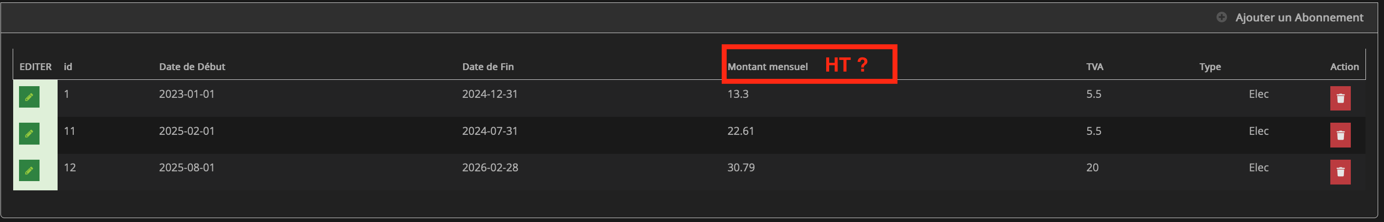 C’est comme ça depuis toujours: (HT). Il n’y a pas que l’abonnement qui est manquant, il y a aussi les taxes et la TVA. C’est tout de même plus lisible quand tu as l’historique de plus d’un an. Tu vois sur le graphe TTC qu’il y a beaucoup de chose.