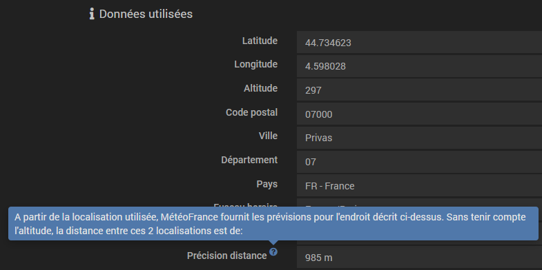 Du coup, j’ai un doute sur la ville qui est retenue par Météo-France en fonction des coordonnées que j’ai indiqué dans les paramètres de Jeedom.