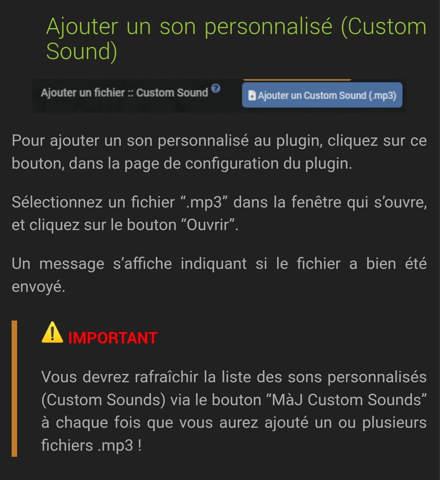Merci, j’ai trouvé la commande. J’ai chargé le fichier.mp3, rafraichi la liste, mais je ne vois rien apparaitre dans liste « custom sounds », cette dernière est vide. J’ai essayé un
