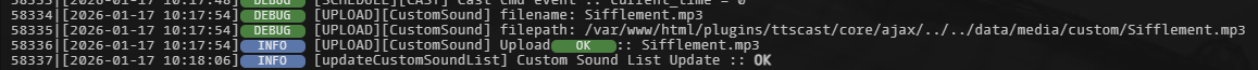Et ensuite, Après avoir cliqué sur le bouton pour rafraichir la liste « MàJ Custom Sounds », dans les logs de TTSCast, tu as bien le message comme quoi les listes ont bien été mises à jour ? :