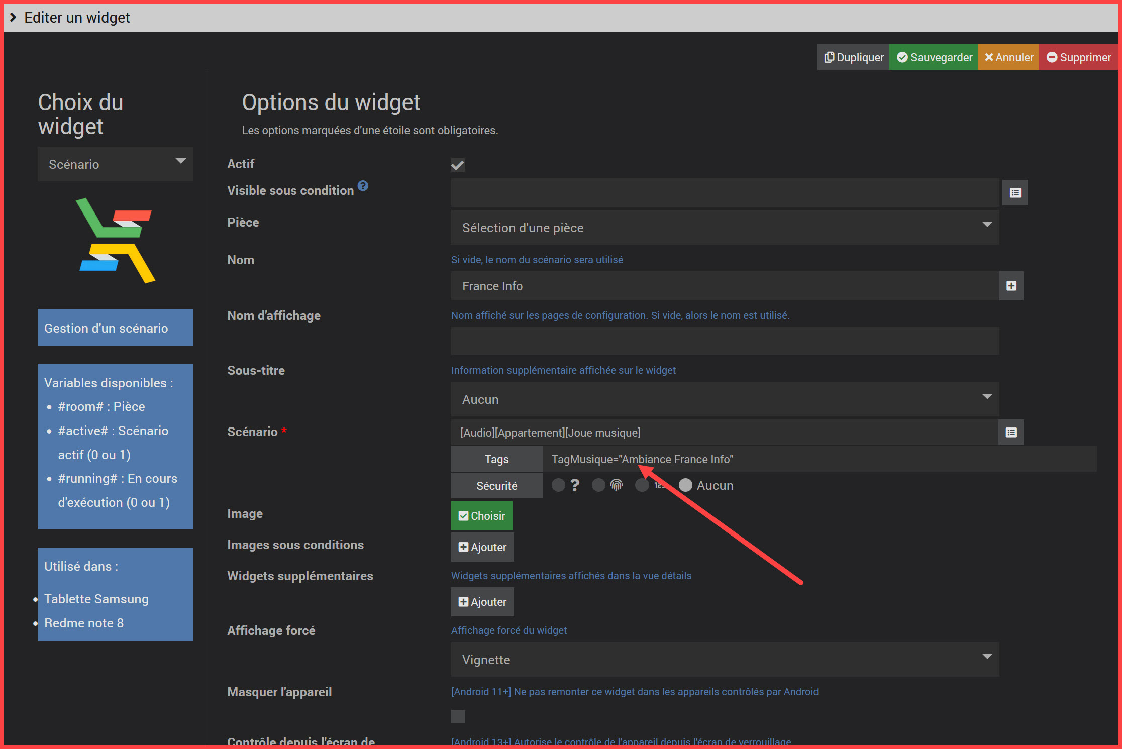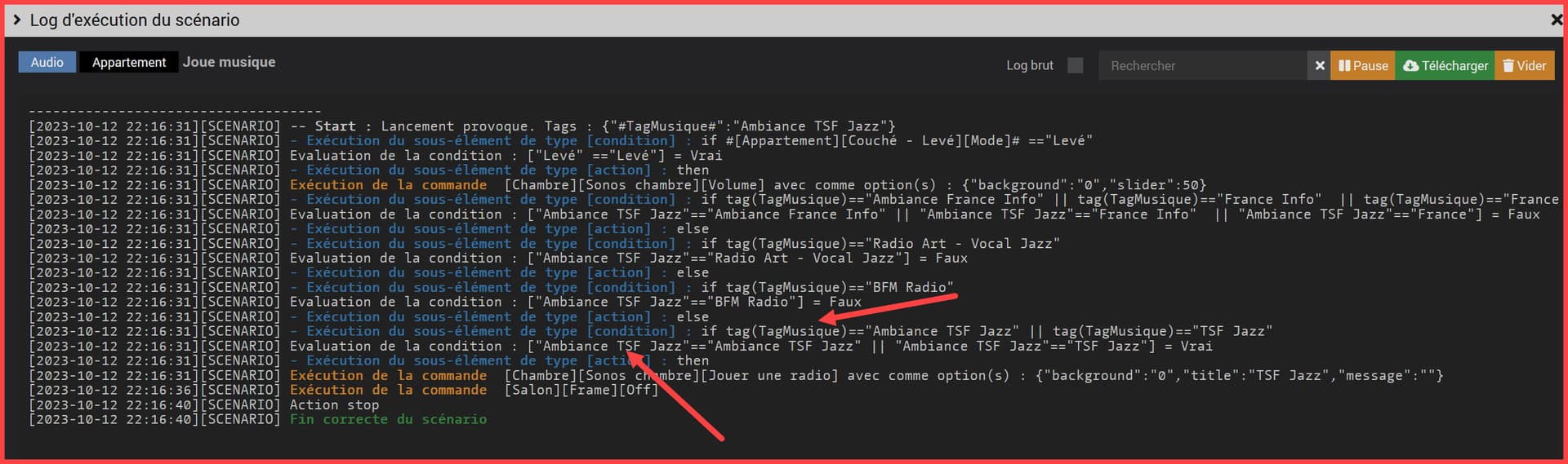 En détail la partie scénario avec tag : id=102&action=start&tags=TagMusique%3D%22France%20Info%22