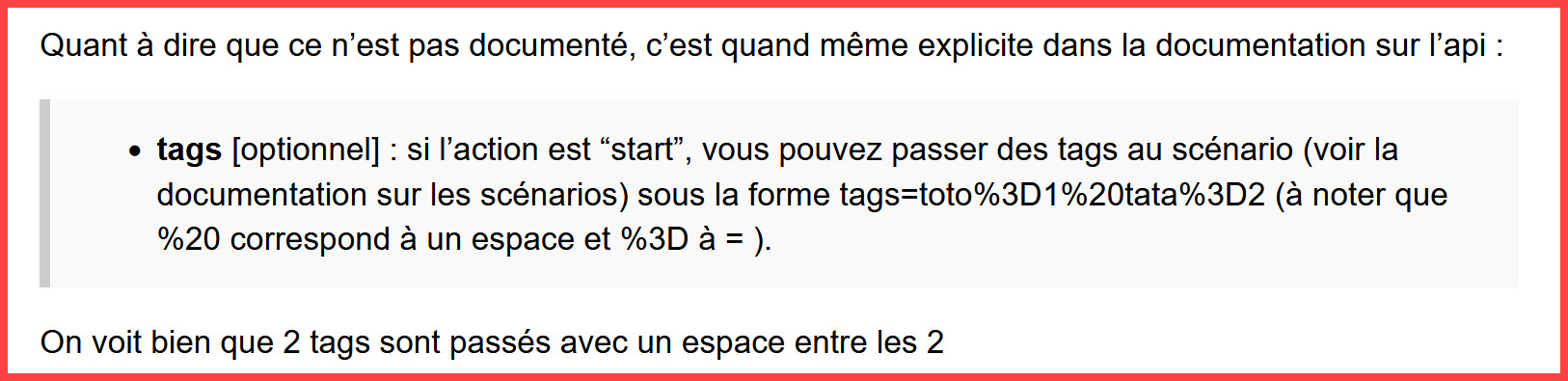 tags [optionnel] : si l’action est “start”, vous pouvez passer des tags au scénario (voir la documentation sur les scénarios) sous la forme tags=toto%3D1%20tata%3D2 (à noter que %20 correspond à un espace et %3D à = ).