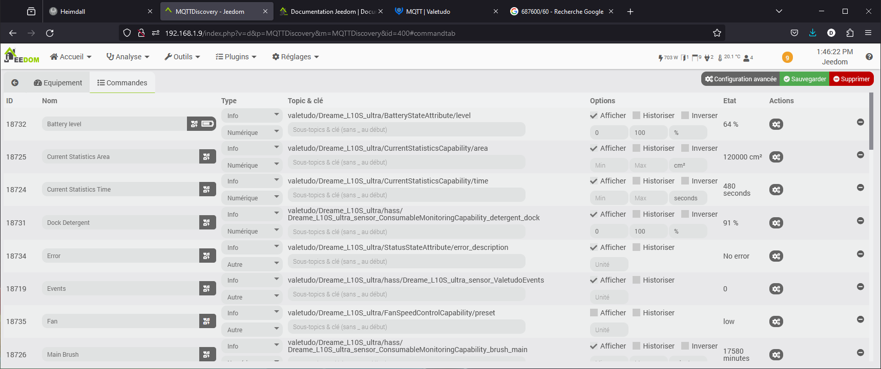 Le robot est correctement joignable par IP et remonte toutes ces informations par MQTT sur un broker distant sous le topic valetudo/Dreame_L10S_ultra.