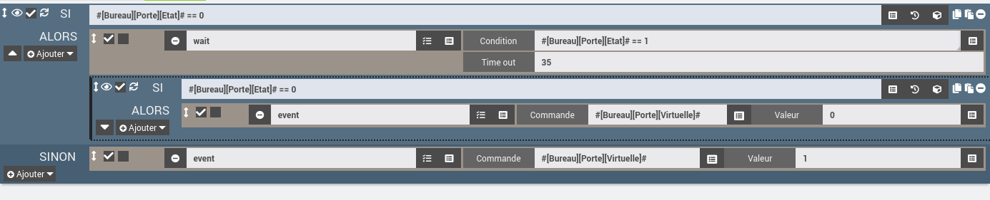 Exemple concret avec une porte virtuelle qui s’ouvre en même temps que la vraie porte mais qui se ferme 35 secondes après la que la vraie porte soit fermée. Et si on re-ouvre la vraie porte avant les 35 secondes, la porte virtuelle s’ouvre aussitôt.