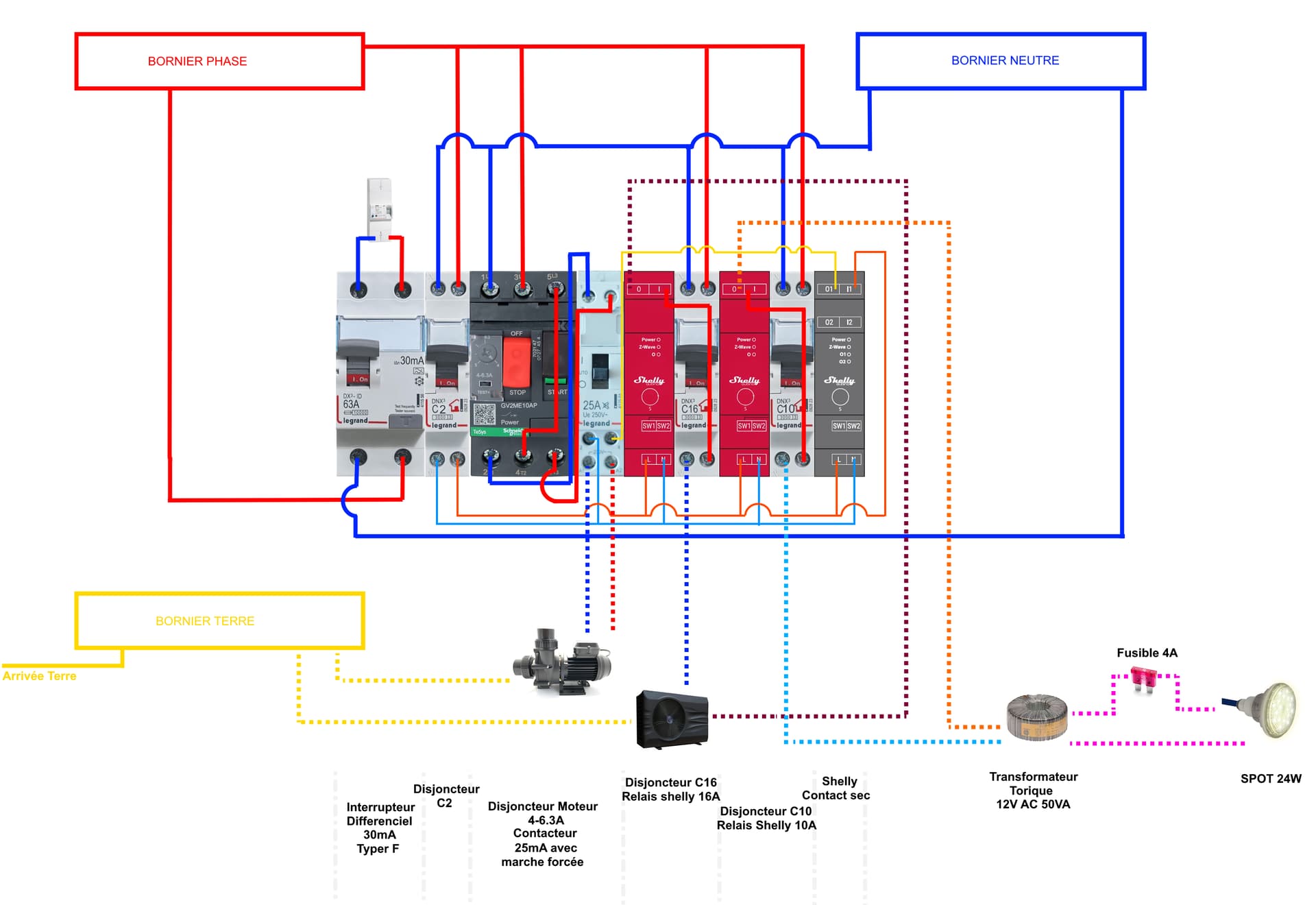 Le disjoncteur C10 sert à la lampe LED (12V AC). Il y a donc un transformateur 12V entre le disjoncteur et la lampe.