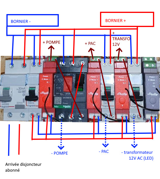 Tous les fils du haut des disjoncteurs vont au bornier (+ et -) alimenté par le différentiel.