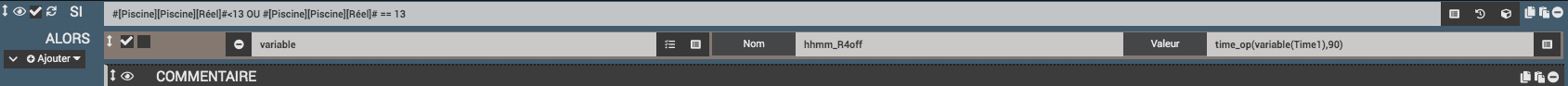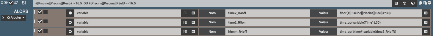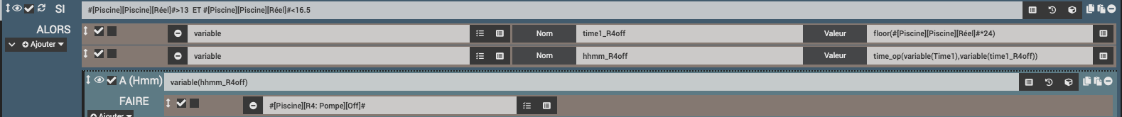 Ceci dit, la commande de la pompe est déclenchée à 7h15 le matin et suivant la température de départ, elle va durer de 2 à 17h. cette température est mesurée au départ et permet de choisir un bloc « si » avec une temp <13 entre 13 et 16,5 et >16,5°. alors à l’intérieur de chaque bloc je fait un calcul suivant qui me permet de faire varier le temps de fonctionnement. pourquoi ces 3 blocs, c’est essentiellement pour permettre de refaire un nouveau calcul du temps à 16h si la pompe tourne encore car la température varie au cours de la journée.