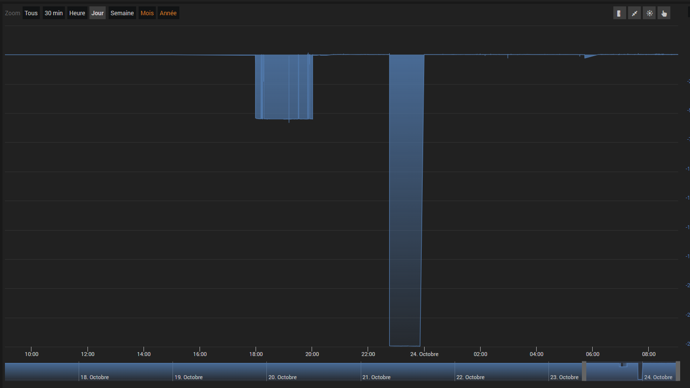 Et coupure chez moi également. Les batteries restent dans leur mode avant la coupure (autoconsommation en journée) mais comme le CT apparaît offline sur les 2 batteries (voir plus bas pour la solution), elles restent en mode standby, donc ni charge ni décharge