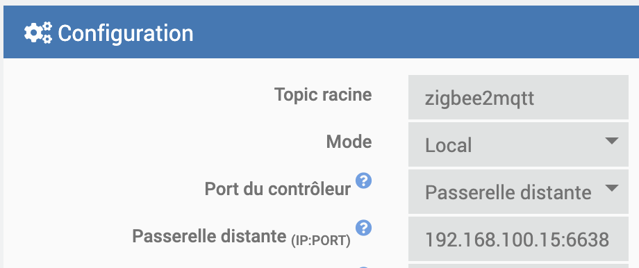 Concretement voici un exemple, dans la configuration jeezigbee, il s’agit de changer l’info "Port du contrôleur, au lieu de choisr un port USB sur lequel serait branchée une clef, tu choisis « Passerelle distante » et en dessous tu saisis l’adresse IP du contrôleur slzb-06 sur ton réseau local ethernet (adresse en général attribuée dynamiquement par ta box/routeur de ton opérateur telecom genre orange ou free)