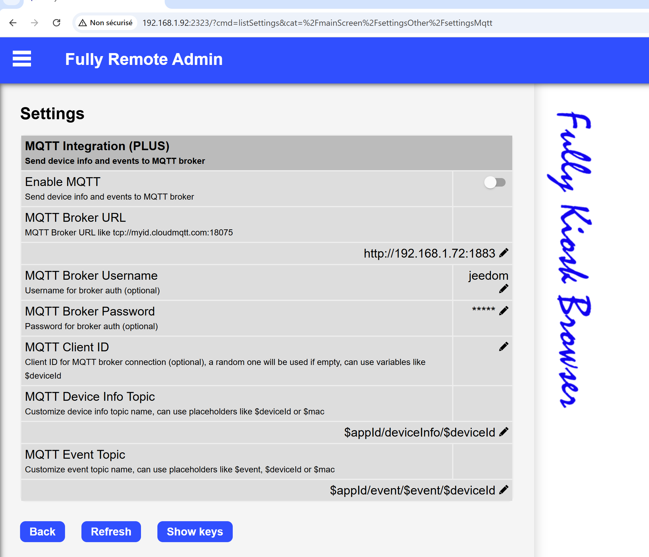 Avec le premier plugin fully kiosk j’avais juste eu a renseigner MQTT Broker URL : tcp://192...:1883 et le plugin récupérait les infos « MQTT ».