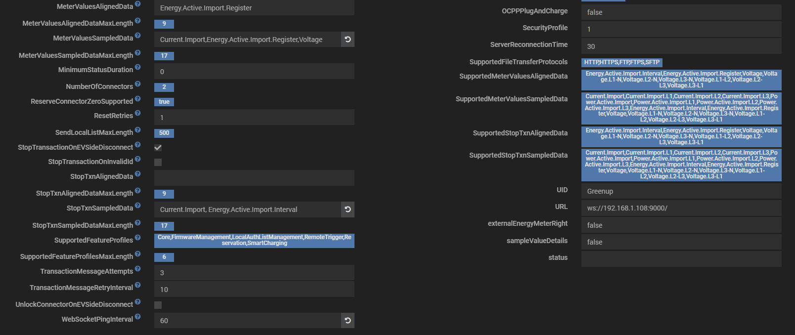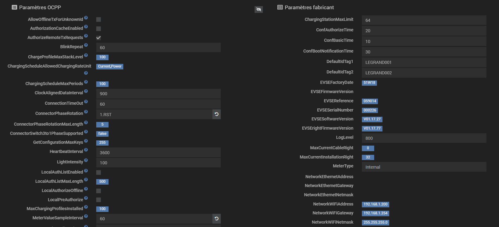 jamais testée à ma connaissance, si aucune information sensible je suis preneur d’une capture de la page des paramètres de la borne dans l’équipement Jeedom en cliquant sur l’oeil de chaque côté pour voir l’ensemble des paramètres OCPP + fabricant (envoi en message privé si tu préfères)