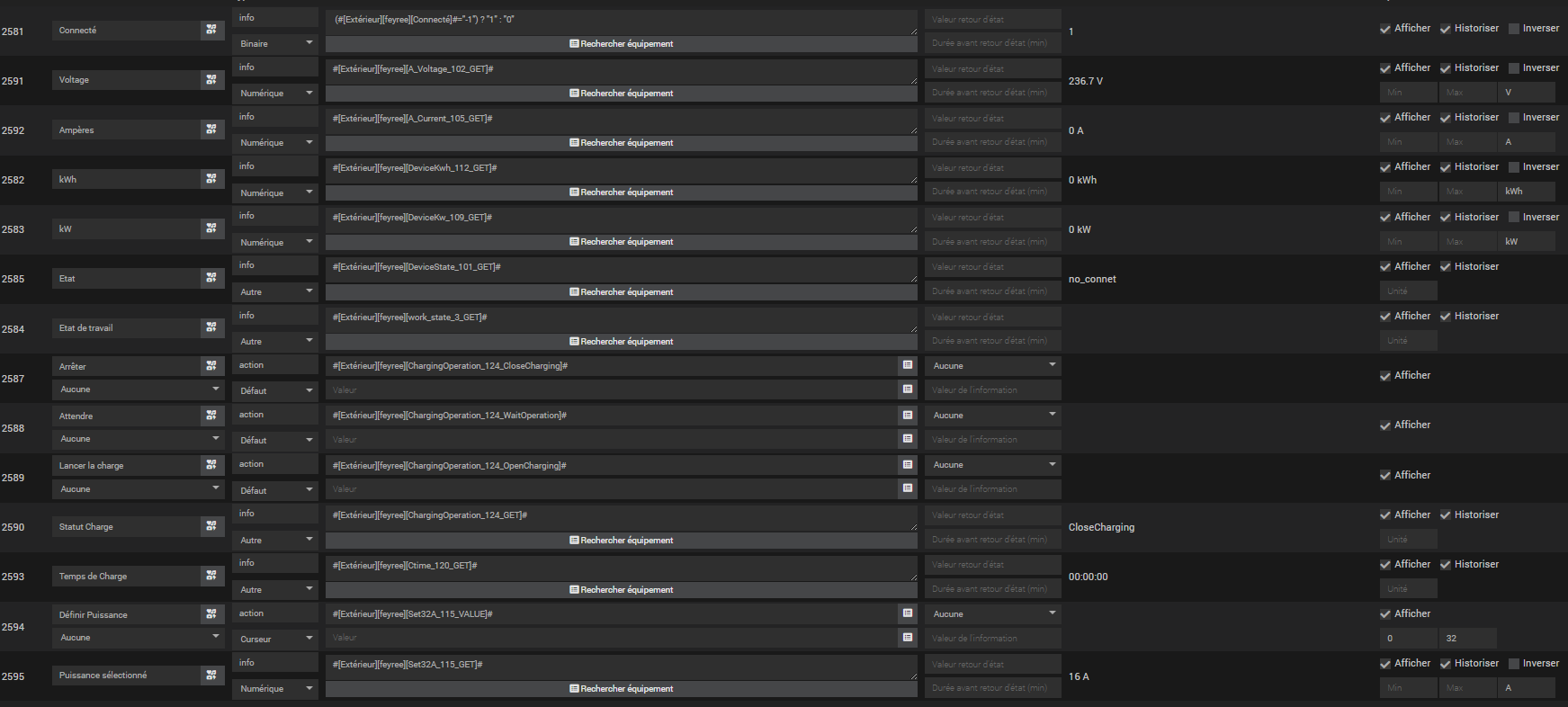 J’ai installé aujourd’hui une borne Feyree 7kW mono « nouveau modèle », tout est Ok sur l’application Tuya, sur Jeedom l’équipement est bien remonté dans le plugin, j’ai créé à la main les différentes informations (tension, intensité, puissance, …) mais je ne parviens pas à créer les commandes pour démarrer/arrêter la charge.