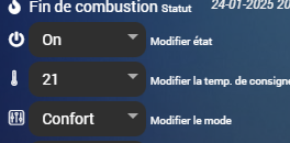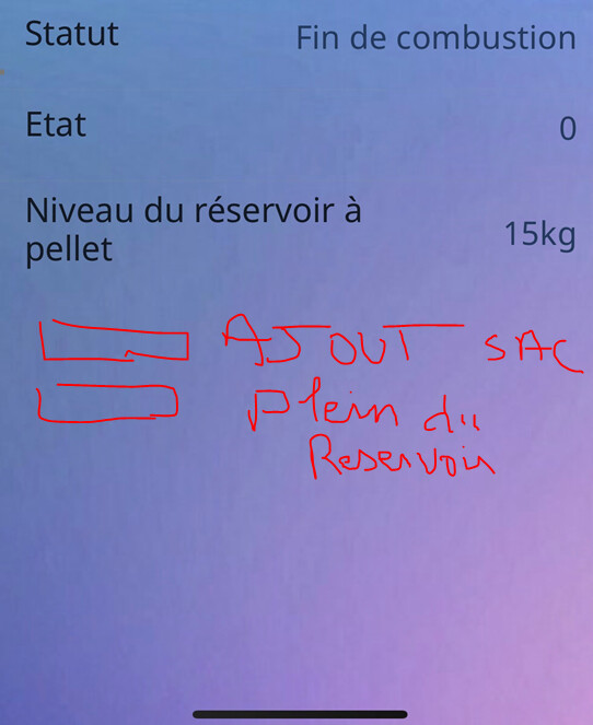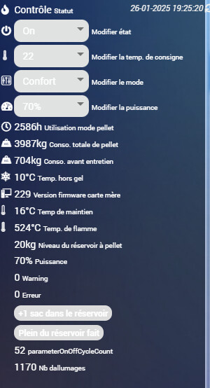 j’ obtient différents message sur la commande Statut , le développeur récupère les information du poêle comme : Allumage en cours, En chauffe, Température atteinte, Mode veille, Nettoyage en cours, Réservoir vide…