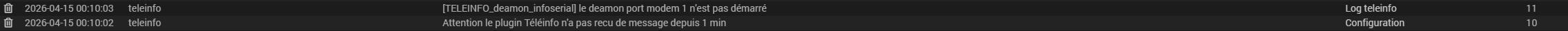 2026-04-15 00:10:04 teleinfo [TELEINFO_deamon_infoserial] le deamon port modem 1 n'est pas démarré