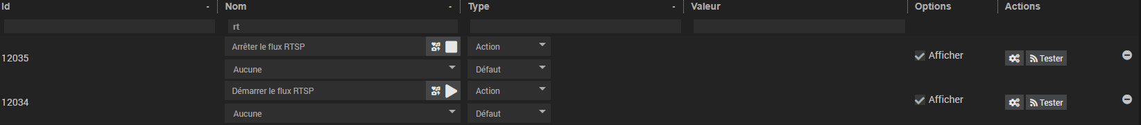 Tu as essayé les commandes Démarrer le flux RTSP et Arreter le flux RTSP ?