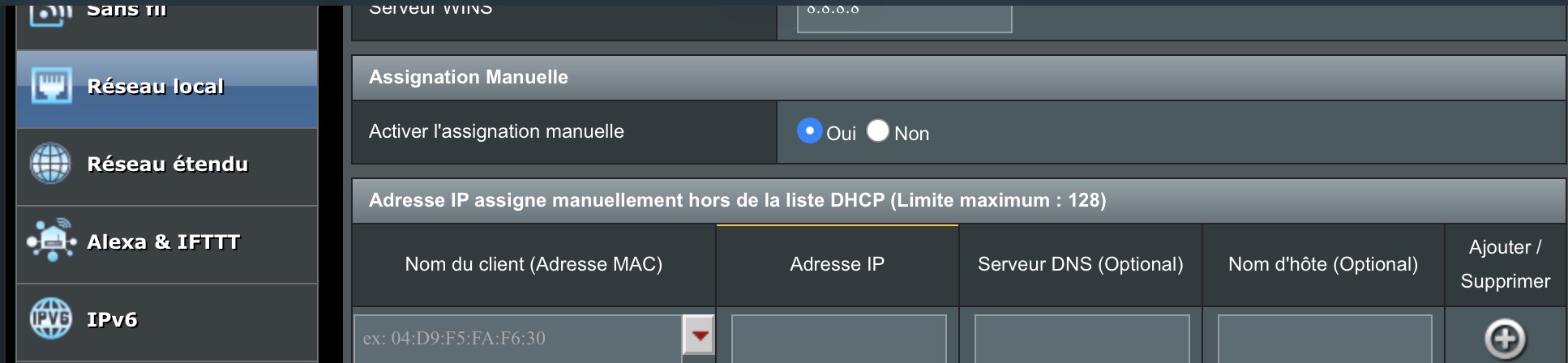J’ai quelques équipements en IP fixes, donc déterminés sur l’équipement lui-même (des imprimantes essentiellement et mon NAS) et hors plage DHCP.