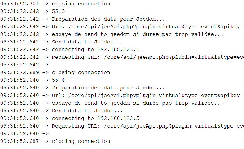 J’ai bien avancé…ca semble donner les bonnes valeurs,Cependant pourrais tu détailler comment tu as les graphs ? Pour l’API dans le programme Arduino, est ce celui de Jeedom ou celle du Virtuel ?