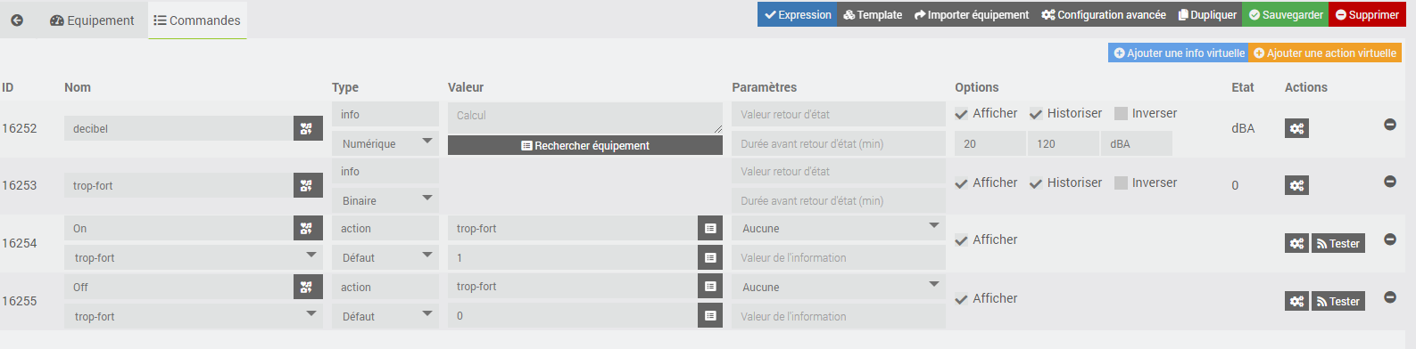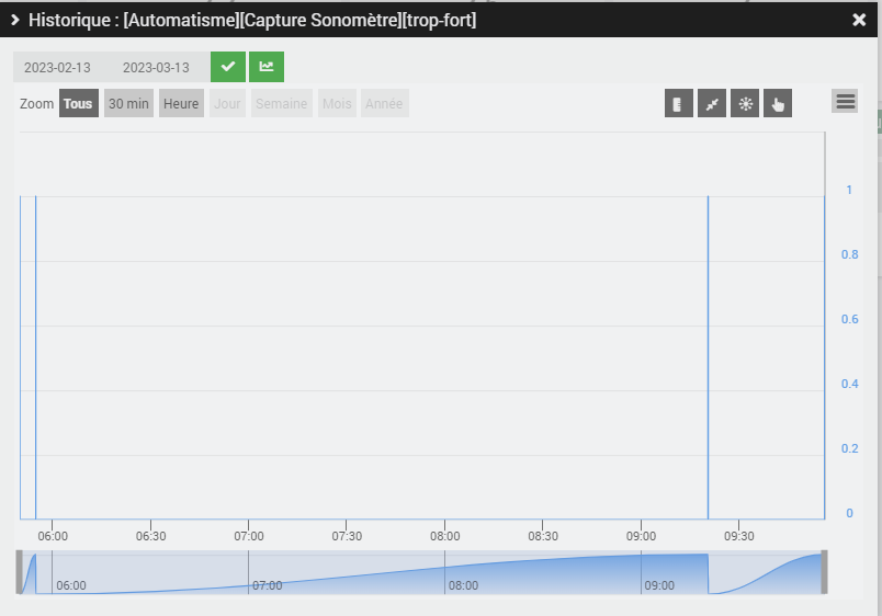 Tu peux faire un scénario qui se déclenchera si la valeur décibel moyenne est trop haute mais j’avais mis un autre virtuel « trop fort » je crois qui lui passe à 1 quand la valeur instantanée dépasse une certaine valeur (codé en dur dans le .ino ) enfin tu peux utiliser les deux perso je ne graph qu’à titre informatif mais les actions en fonction des niveaux sont évidement possible via jeedom.