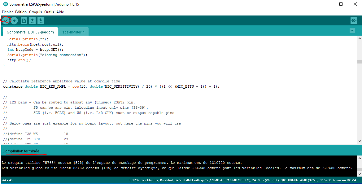 Le download se passe bien avec le ESP32-vroom-DA de l’Arduino IDE (J’ai pris un AZDelivery ESP32 NodeMCU Module WLAN WiFi Dev Kit C Development Board avec CP2102) . Est-ce celui la que tu utilises ? Ou as tu pris ESP32 Dev Module ? Pour le micro c’est TECNOIOT INMP441 Omnidirectional Microphone Module I2S Interface MEMS High Precision…et l’écran : AZDelivery I2C Display 128 x 64 Pixel 0.96 Pouce, SSD1306 caractères de Couleur Blanche, écran Compatible avec Arduino et Raspberry Pi…Comment as tu loadé le fichier sos-iir-filter.h car ce n’est pas un fichier ino ?