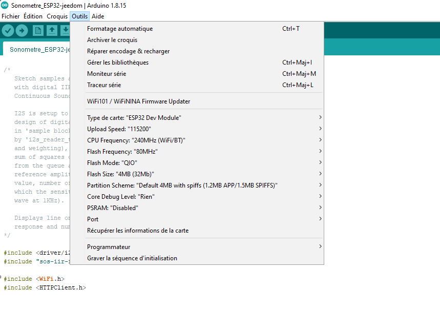 J’ai suivi ton cablage, utilisé Arduino IDE en prenant le ESP32 Dev Kit et j’ai utilisé les 2 fichiers Sonometre_ESP32-jeedom.ino et sos-iir-filter.h mais ca ne marche pas …Aurais tu des conseils pour y arriver ? Merci