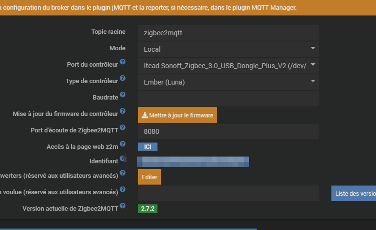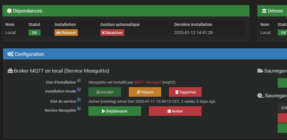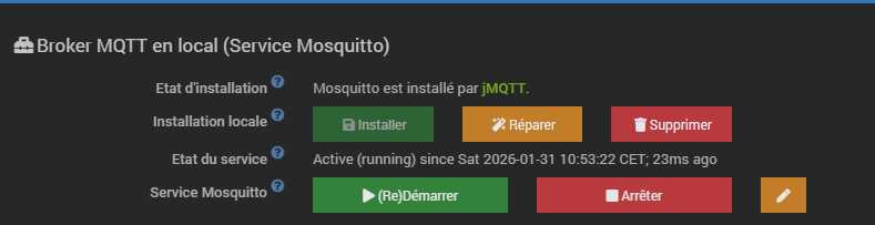 Verifiez aussi Le plugin « MQTT Manager » et au besoin cliquez sur le bouton « réinstaller » (ligne « Broker Mosquitto » car il me semble que vous avez une ligne orange d’avertissement qui apparait lorsque vous êtes sous JeeZigbee).