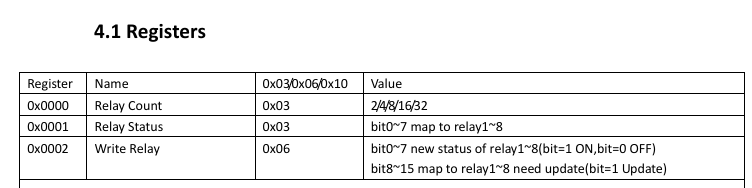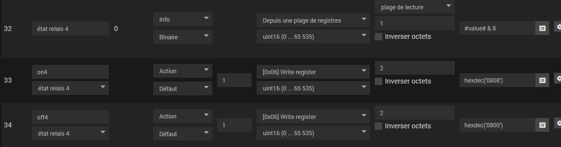 Pour la commande des relais, le registre de valeur est à couper en 2 octets :