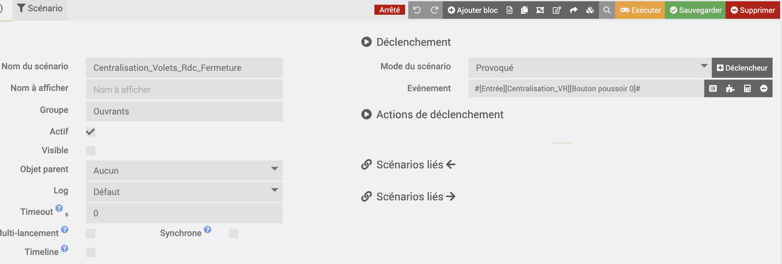 J’ai créé deux scénarios pour ouverture VR Rdc / Fermeture VR Rdc. Lorsque j’appuie sur le poussoir, je vois bien que la commande est reçue par le shelly mais le scénario ne se lance pas. J’ai bien mis en déclencheur le Shelly.