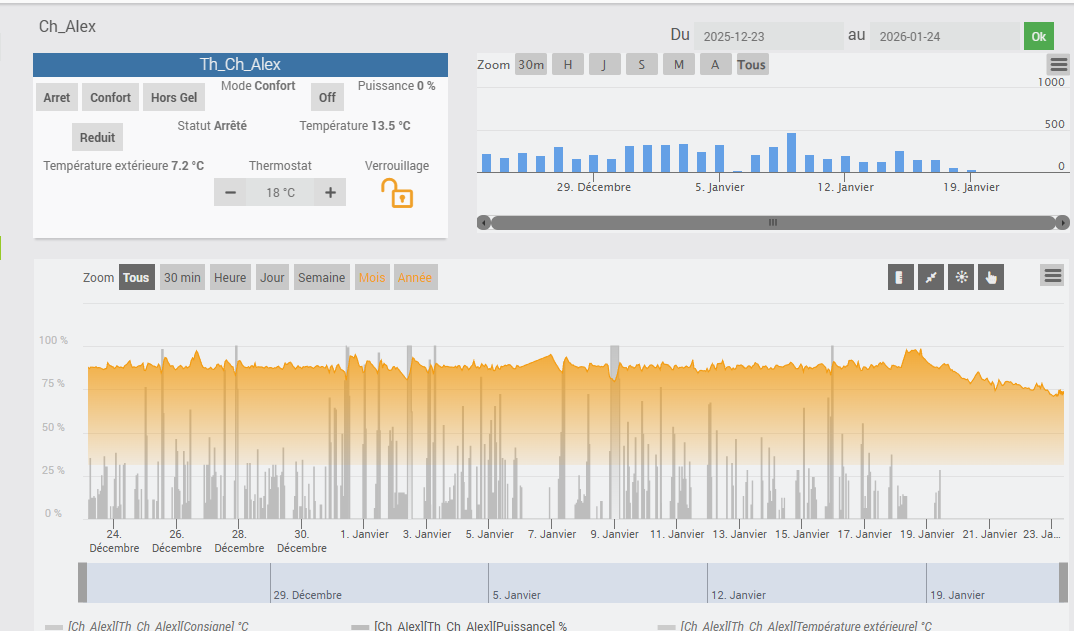 Par exemple sur ce thermostat on voit sur les rapports que malgré une baisse de la température de la pièce le thermostat de commande plus de mise en chauffe :