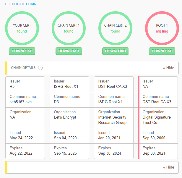 La réponse est que mon certificat a un problème root 1 missing. Ceci est hors de la compétence du support Jeedom.